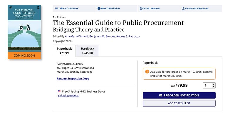 Public procurement, the strategic process governments use to efficiently and ethically acquire goods and services, is a critical administrative function. And yet, few who practice or teach government contracting have received much formal training in the theories, tactics, and techniques of public procurement. The Essential Guide to Public Procurement is designed for all those who “fall into” procurement with little formal training: academic instructors teaching procurement courses without specialized backgrounds, students in Public Administration programs seeking to understand government contracting, researchers exploring this interdisciplinary field, and practitioners at all levels of government who manage over $10 trillion allocated annually in global procurement spending.