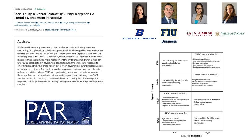 Our latest paper "Social equity in federal contracting during emergencies: A portfolio management perspective", published in Public Administration Review together with Ana Maria Dimand, Evelyn Rodriguez-Plesa and Andra Hiriscau analyzes what procurement factors governments should consider ensuring appropriate small disadvantaged business inclusion during emergencies.