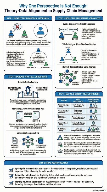 That distinction matters because supply chain phenomena are often asymmetric. Buyers and suppliers may not perceive trust, fairness, or dependence in the same way. A third actor, such as a logistics provider or a lower-tier supplier, can shape outcomes even when it sits outside the focal dyad. Network position can affect risk exposure or innovation even when a firm’s direct partner relationships look stable. When we study these mechanisms with one-sided data, we can miss misalignment, hidden dependencies, and indirect effects.